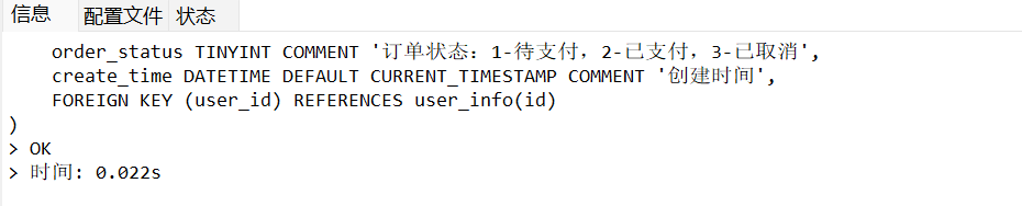 先创建订单表 order_info , 关联 user_info 表: