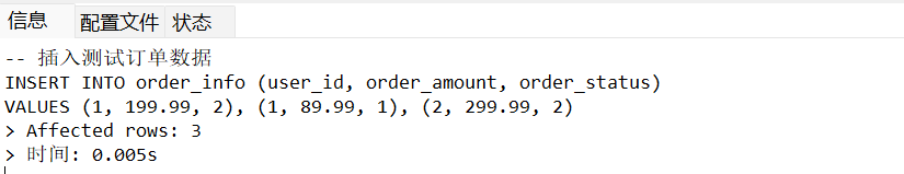 INSERT INTO order_info (user_id, order_amount, order_status)