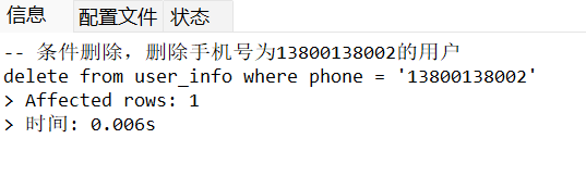 -- 条件删除:删除手机号为13800138002的用户