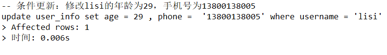 UPDATE user_info SET age = 29, phone = '13800138005' WHERE username = 'lisi';