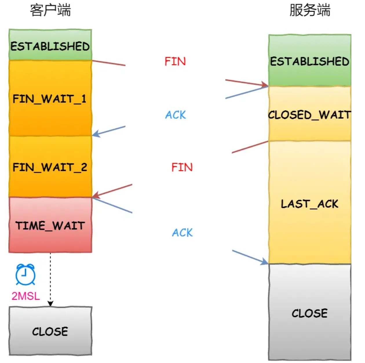 第四次挥手时,客户端发送给服务端的 ACK 有可能丢失,如果服务端因为某些原因而没有收到 ACK 的话,服务端就会重发 FIN,如果客户端在 2*MSL 的时间内收到了 FIN,就会重新发送 ACK 并再次等待 2MSL,保证服务端顺利关闭连接。