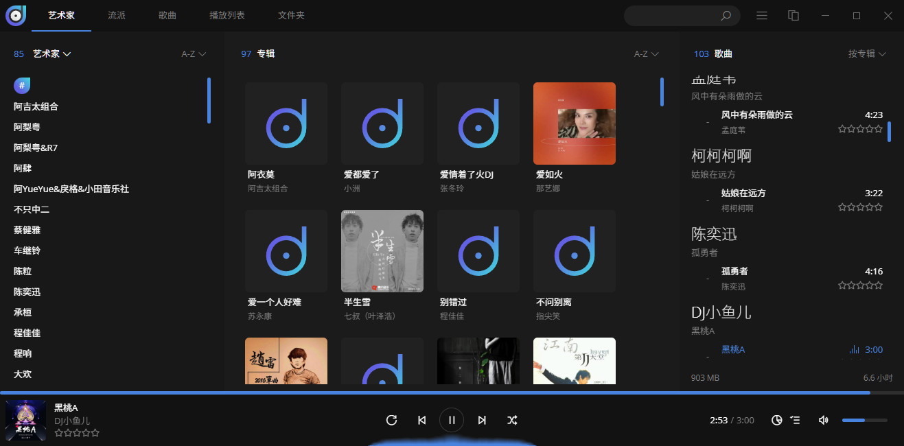 软件采用简约现代的界面风格,与新版 Windows 系统视觉适配度极高,布局清晰明了。核心模块涵盖艺术家、专辑、播放列表、文件夹等,同时支持 A-Z 字母排序查找功能,帮助用户快速定位目标歌曲,操作直观易懂,大幅降低使用门槛。