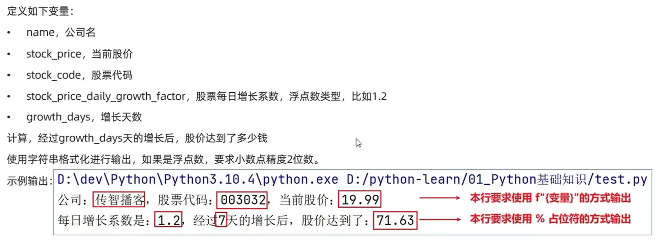 print("每日增长系数, %.1f, 经过%d天增长后, 股价达到了: %.2f"