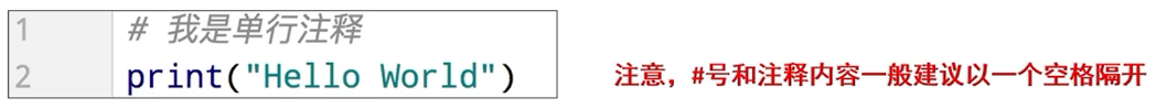 单行注释 :以 #开头,#右边的所有文字当作说明,而不是真正要执行的程序,起辅助说明作用