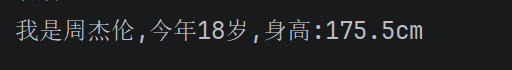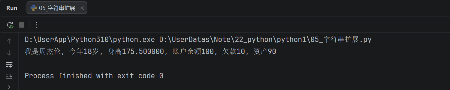 info = "我是%s, 今年%d岁, 身高%f, 账户余额%d, 欠款%d, 资产%d" % (name, age, height, money, debt, money-debt)