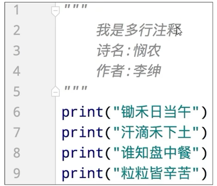 多行注释: 以 一对三个双引号引起来("""注释内容""") 来解释说明一段代码的作用和使用方法
