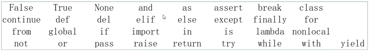 - 关键字在Puthon中都有特定用途, 我们不可以使用它们作为标识符