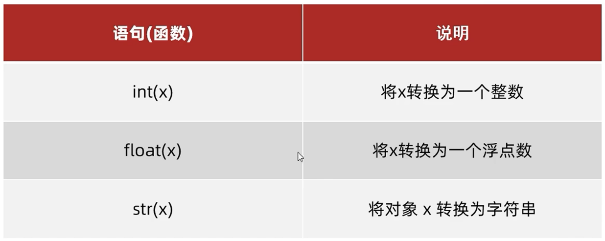 - 后续学习的input()语句,默认结果是字符串,若需要数字也需要转换