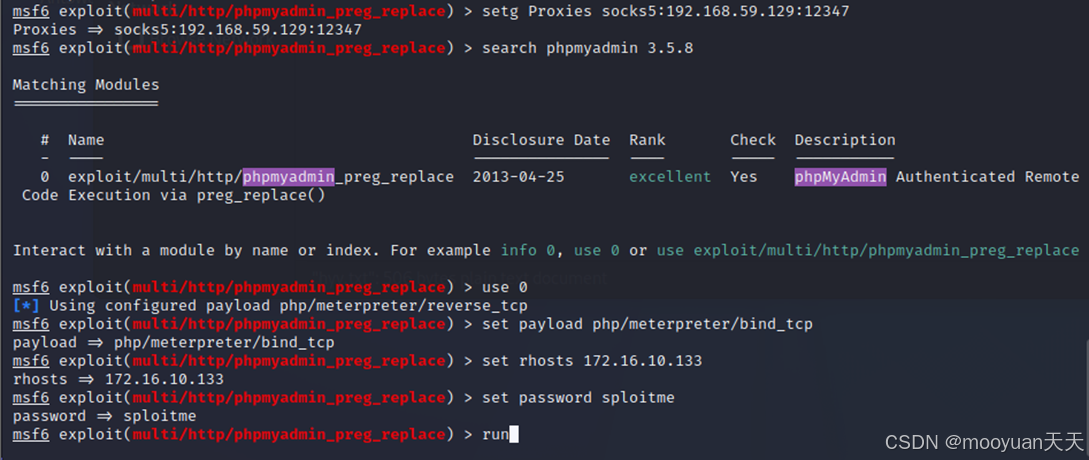 我们使用上一步获取到的用户名和密码登录phpmyadmin('root', 'sploitme'),通过Metasploit框架针对内网第三层目标(172.16.10.133)实施phpMyAdmin漏洞攻击。首先配置全局Socks5代理指向EarthWorm隧道入口(12349端口),确保流量穿透多层内网;随后选用phpMyAdmin的preg_replace漏洞模块(CVE-2013-3238),设置目标IP及Bind TCP载荷使目标监听端口;基于前期信息收集设置正确的phpMyAdmin登录密码(sploitee)。