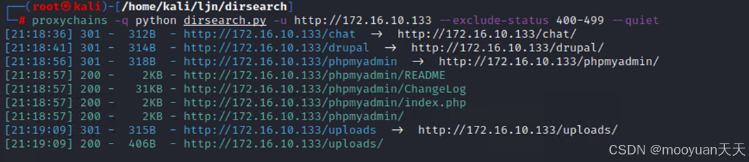 proxychains -q python dirsearch.py -u http://172.16.10.133 --exclude-status 400-499 --quiet