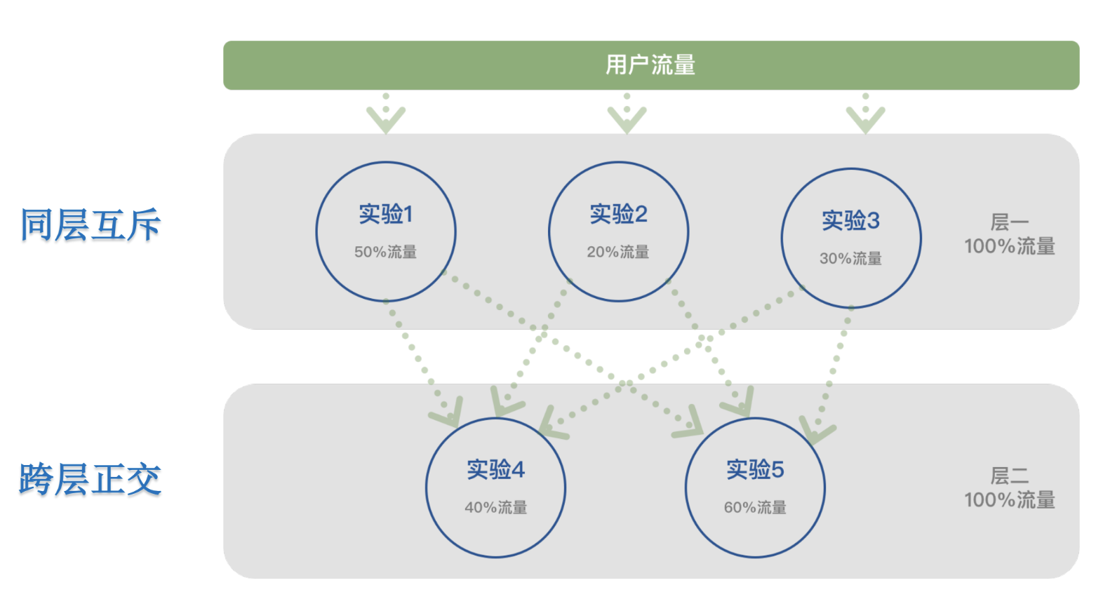 这就涉及到了流量分发的底层架构:分层(Layering)与分域(Domain/Bucketing) 。基于此,衍生出了两种最基本的实验关系:正交(Orthogonal)与互斥(Mutually Exclusive)。