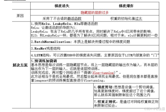 | 梯度消失 | 层越靠前,‖∂Loss/∂W‖趋 0 | 链式<1 连乘 | 1) ReLU 家族激活 2) BN + 残差 3) Xavier/He 初始化 |