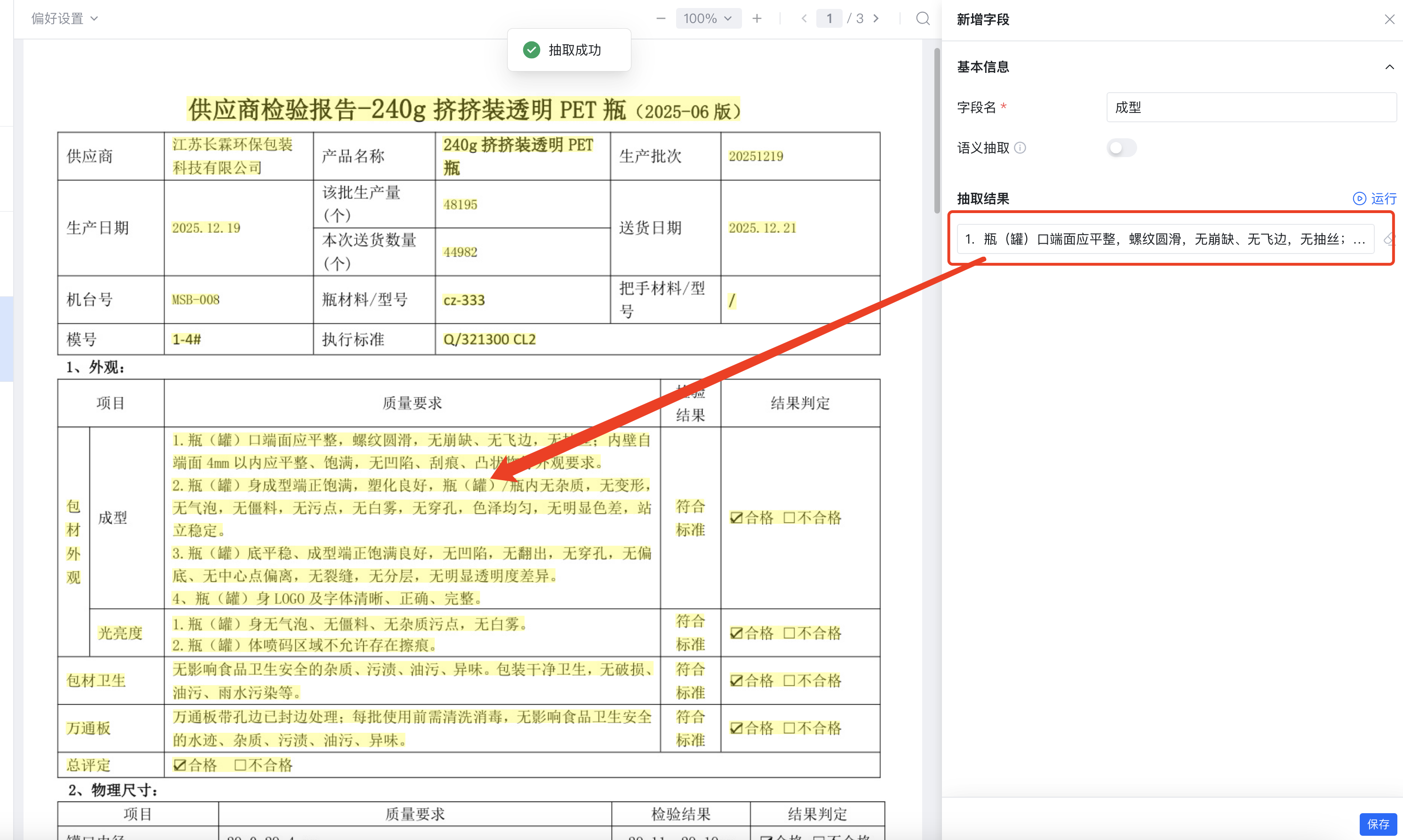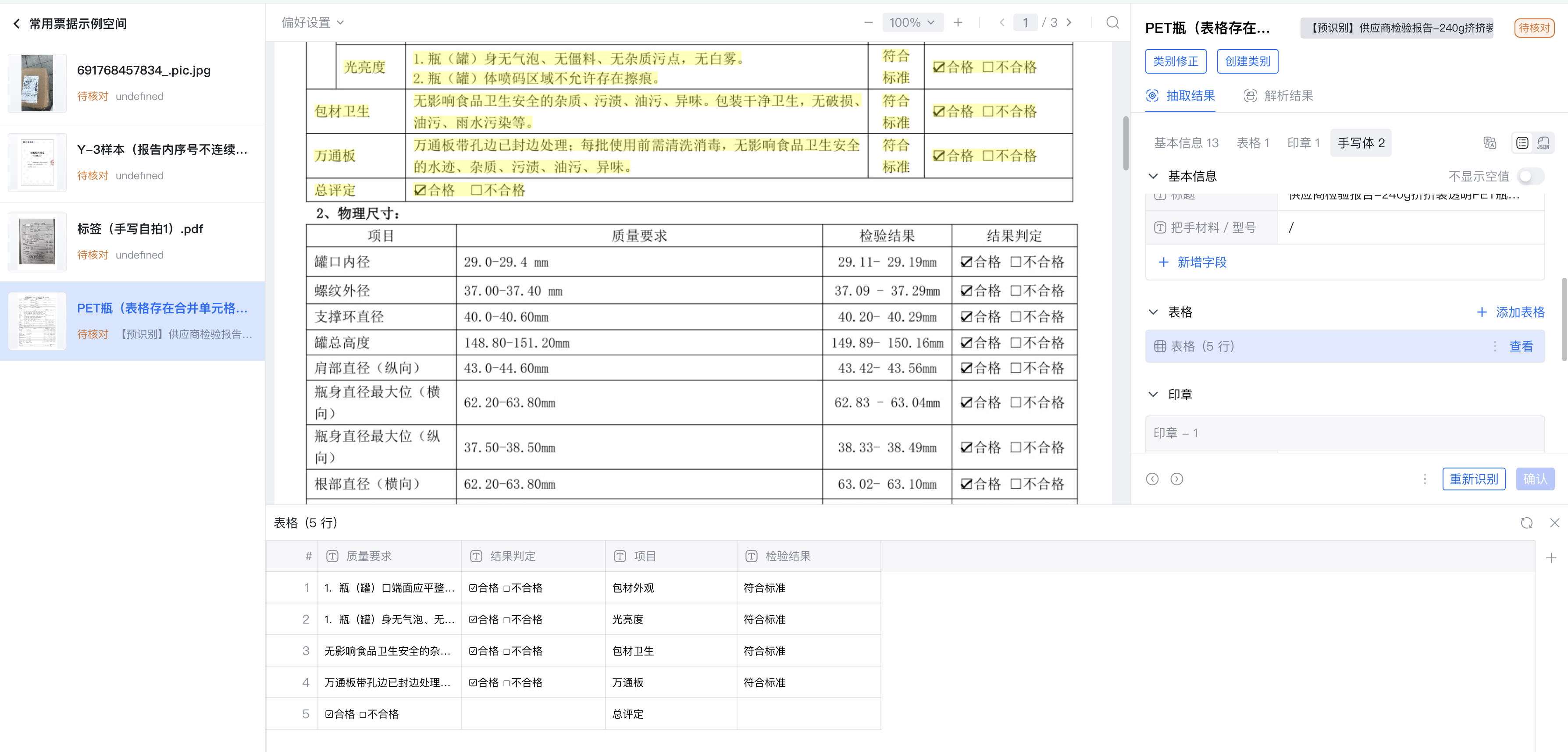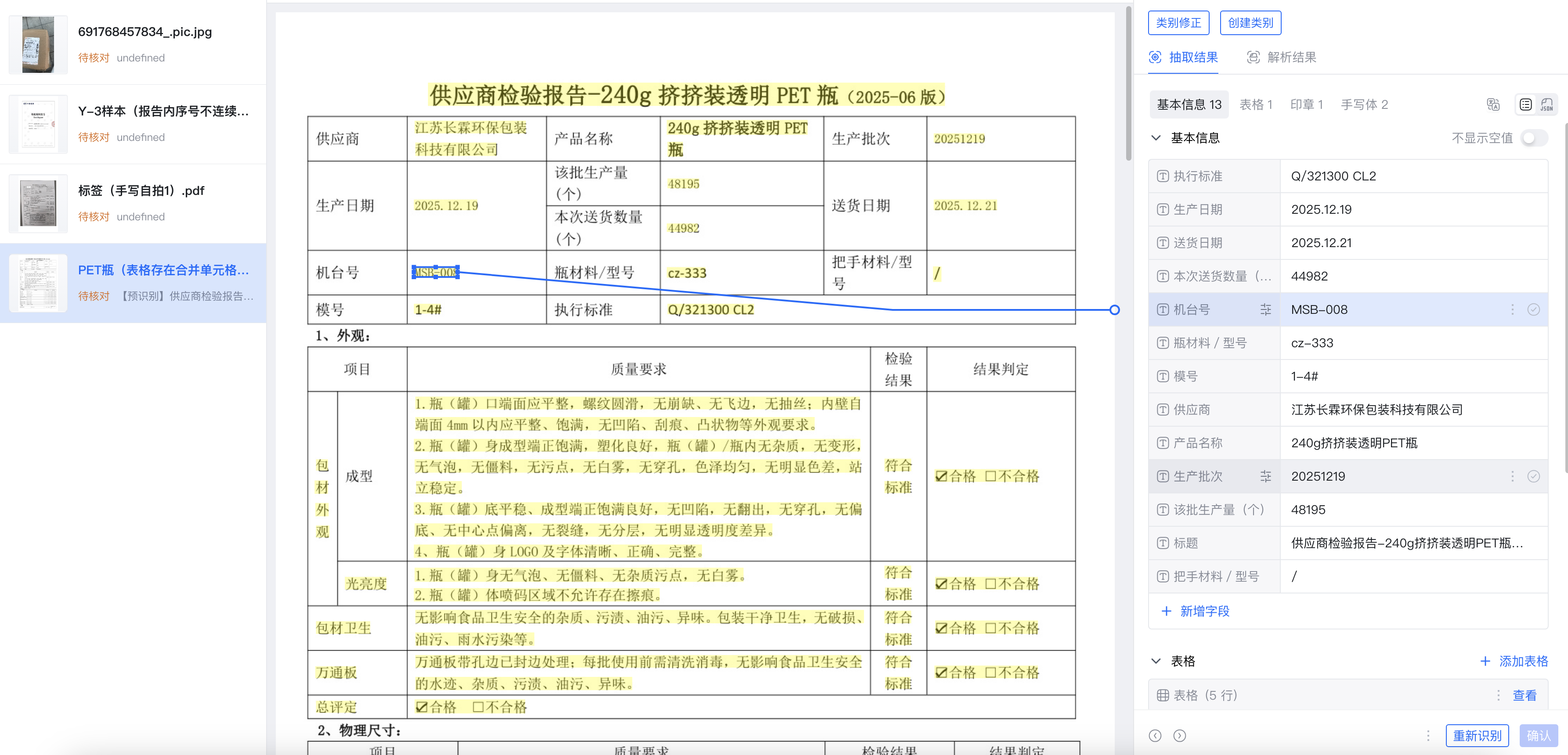 预设各类文档核心基础字段(如检验报告的外观、物理尺寸、壁厚等),满足行业通用场景。