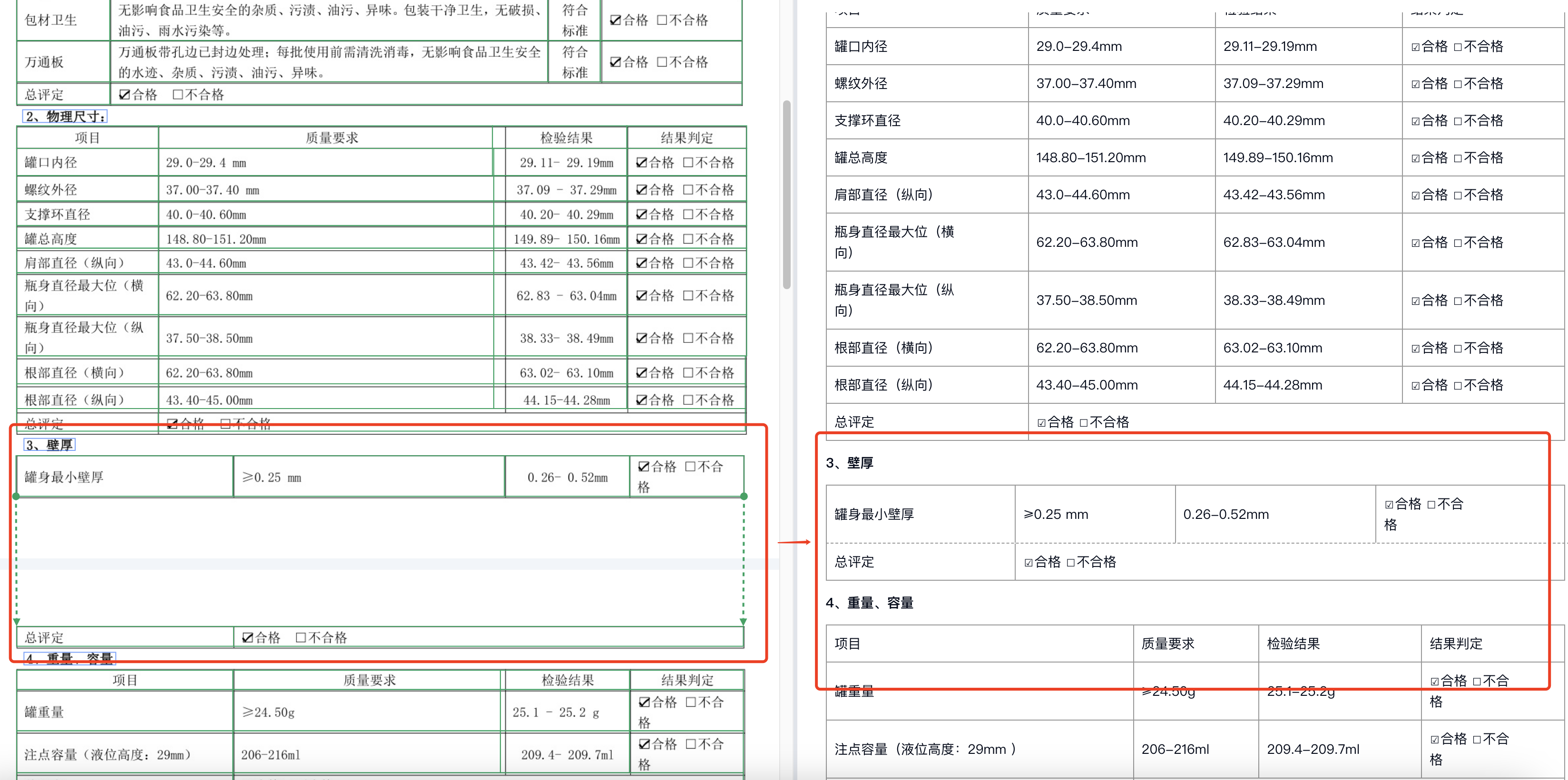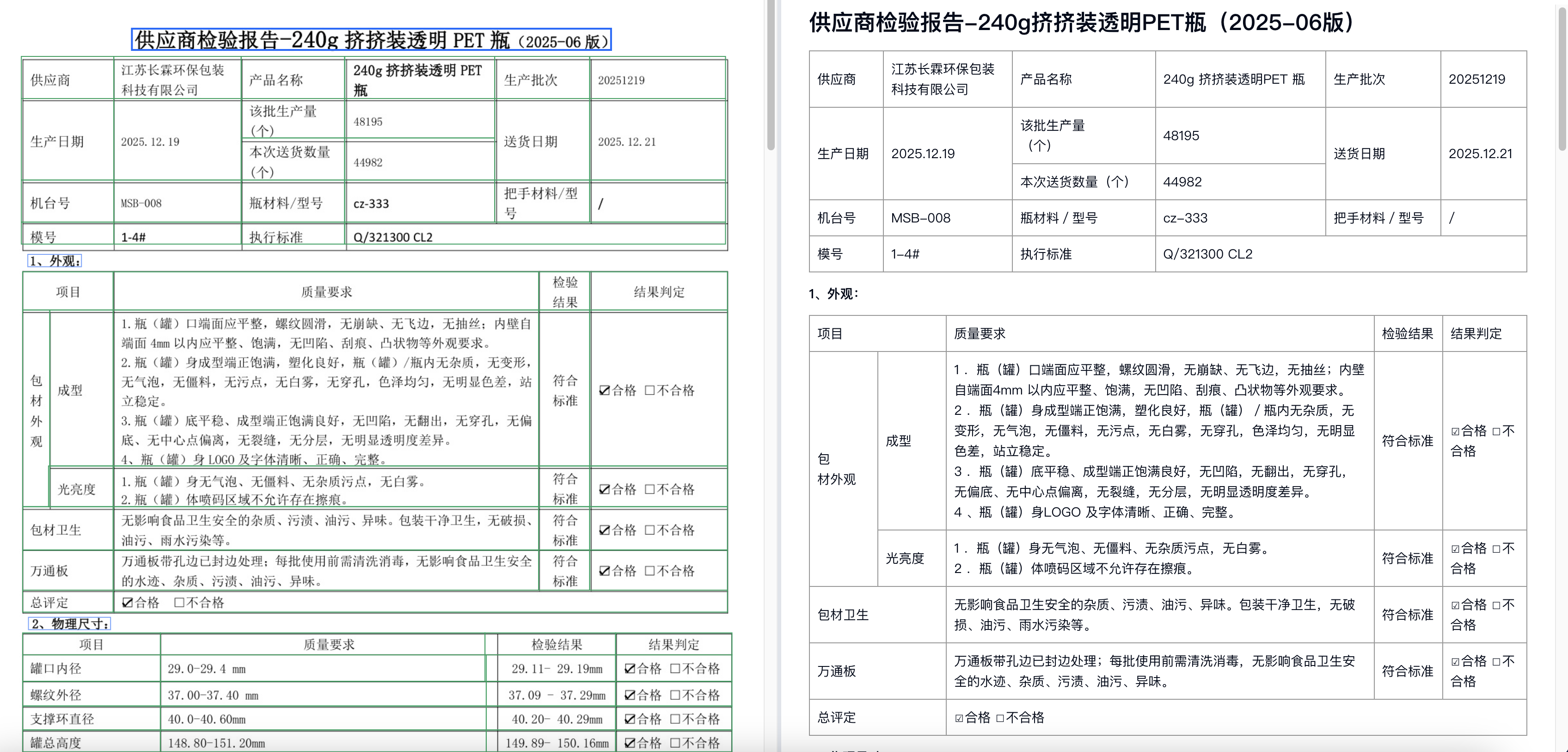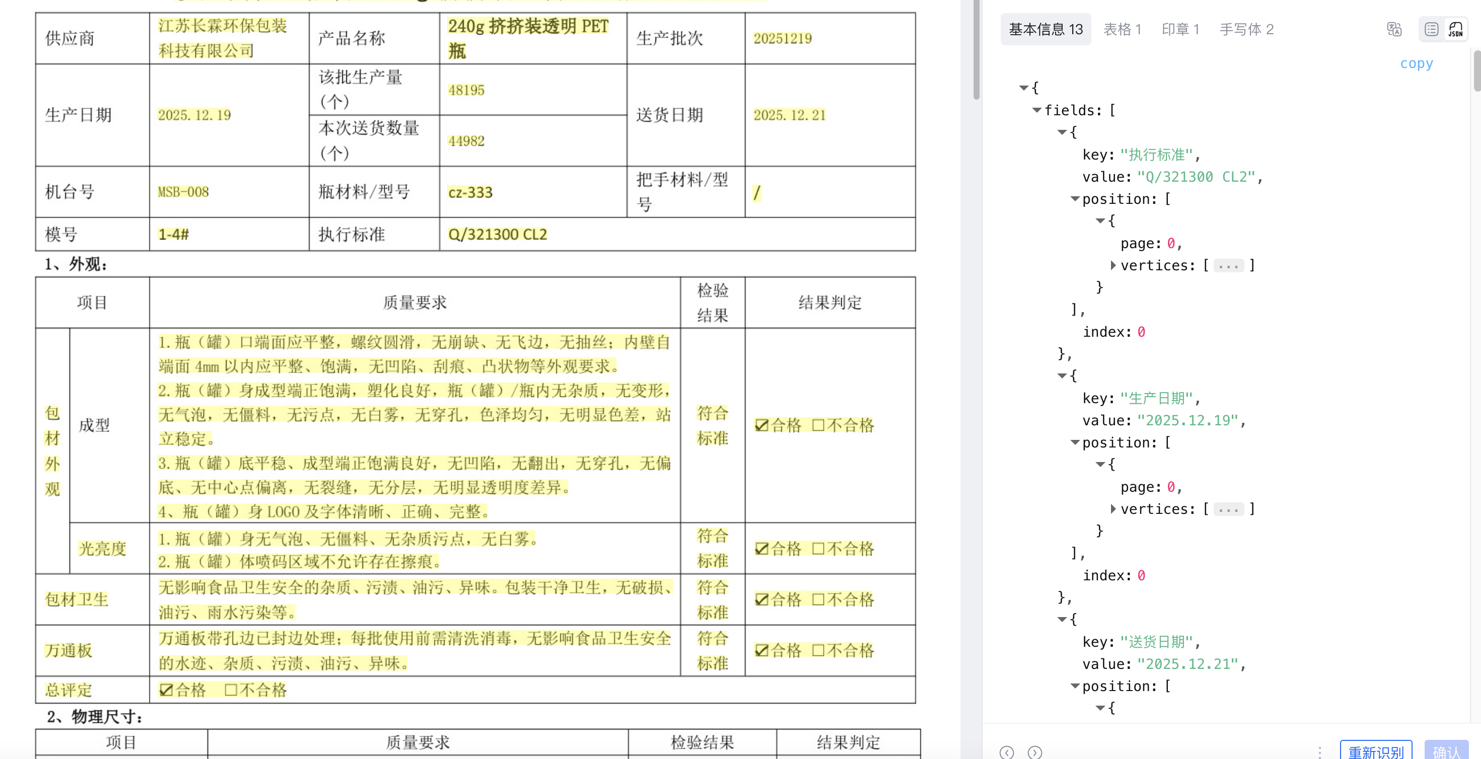 预设各类文档核心基础字段(如检验报告的外观、物理尺寸、壁厚等),满足行业通用场景。