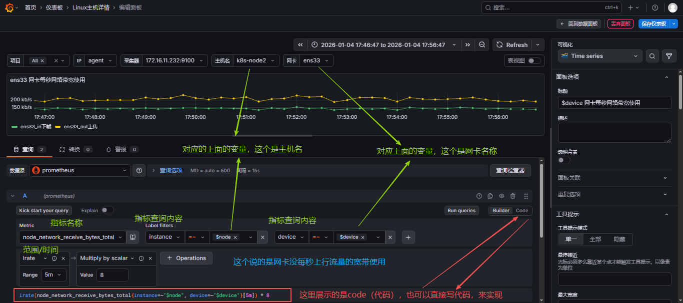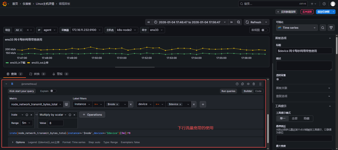 - 选择指标,可以同时添加多个指标,这里我就选择做网卡每秒网络带宽使用,那就需要添加上行和下行流量,可以参考此文:【云原生】Prometheus之PromQL用法详解 来写