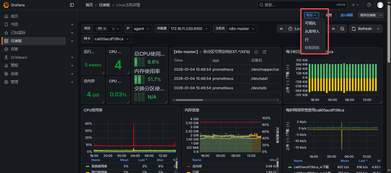 - 说明: 这是最常用的选项,用于在仪表板上添加一个新的可视化组件(即一个面板)。面板可以展示图表、表格、日志、仪表等,是仪表板展示数据的主要方式。你可以在面板中编写查询,选择数据源,设置图表类型,调整样式等。