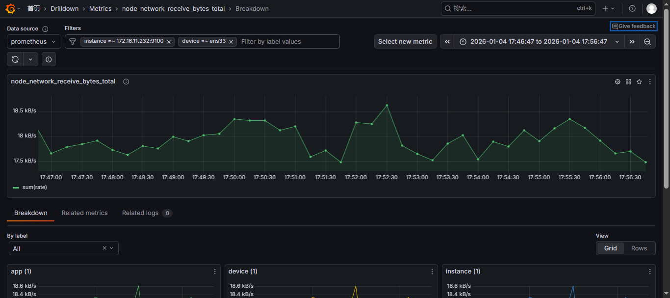 Open in Grafana Metrics" 是一个功能,主要用于快速跳转到与当前指标相关的详细分析页面,帮助用户更深入地查看和分析特定指标的详细数据。这个功能通常与 Prometheus、Loki 等数据源集成;