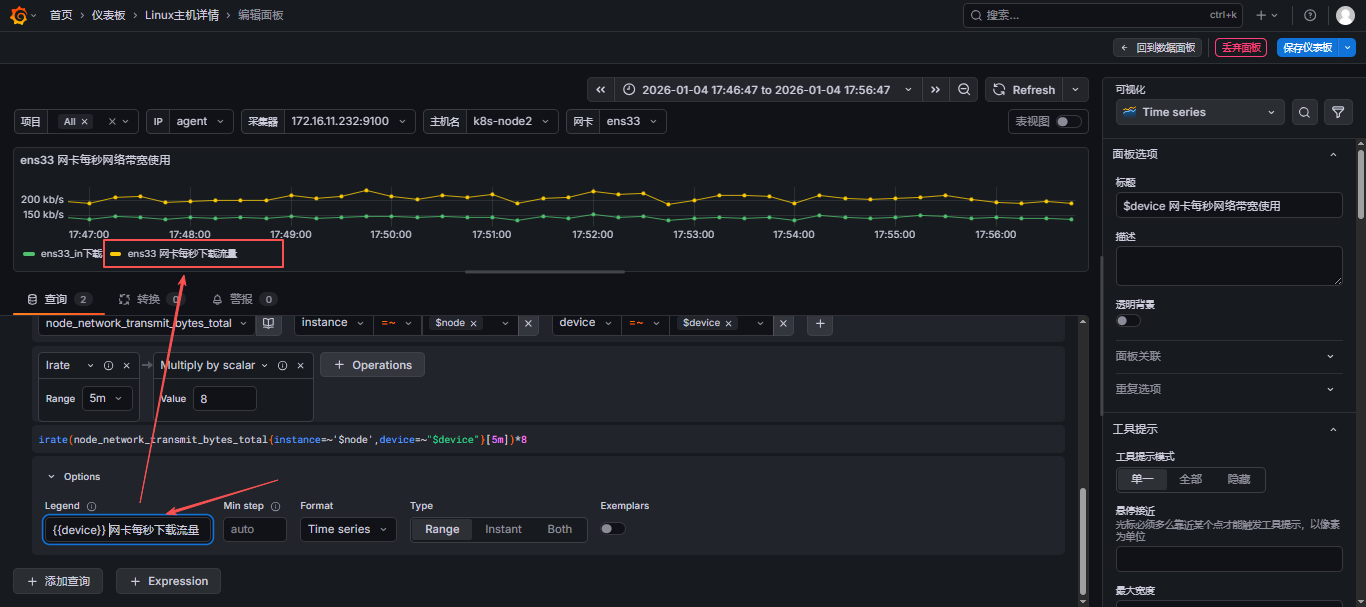 Options-Legend-Custom- 可以使用变量,变量使用{``{device}}这样使用;例如,吧下面的名称改为哪个网卡的每秒下载流量;