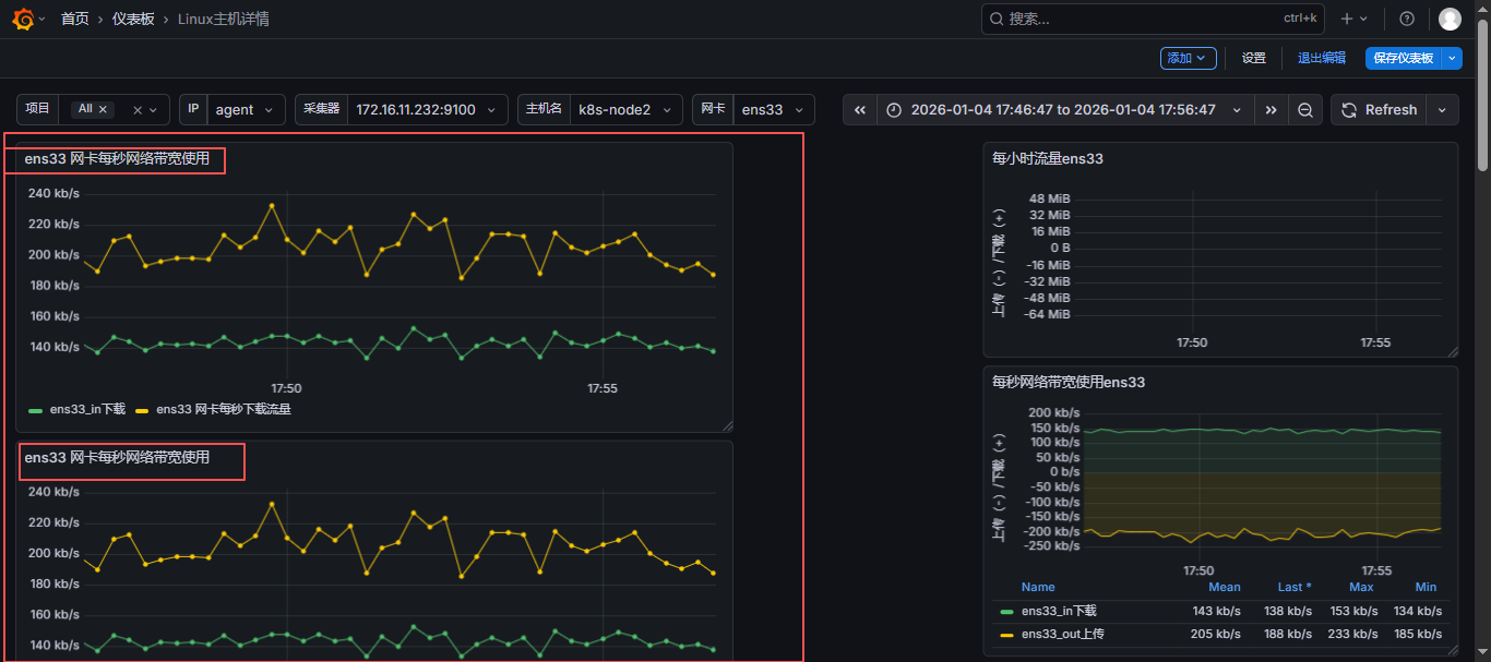 - 达到自己想要的效果之后就可以点击右上角的保存仪表板了,直接保存,再返回数据面板就可以看到自己创建的了;也可以根据主机名、网卡名称进行自动变化;