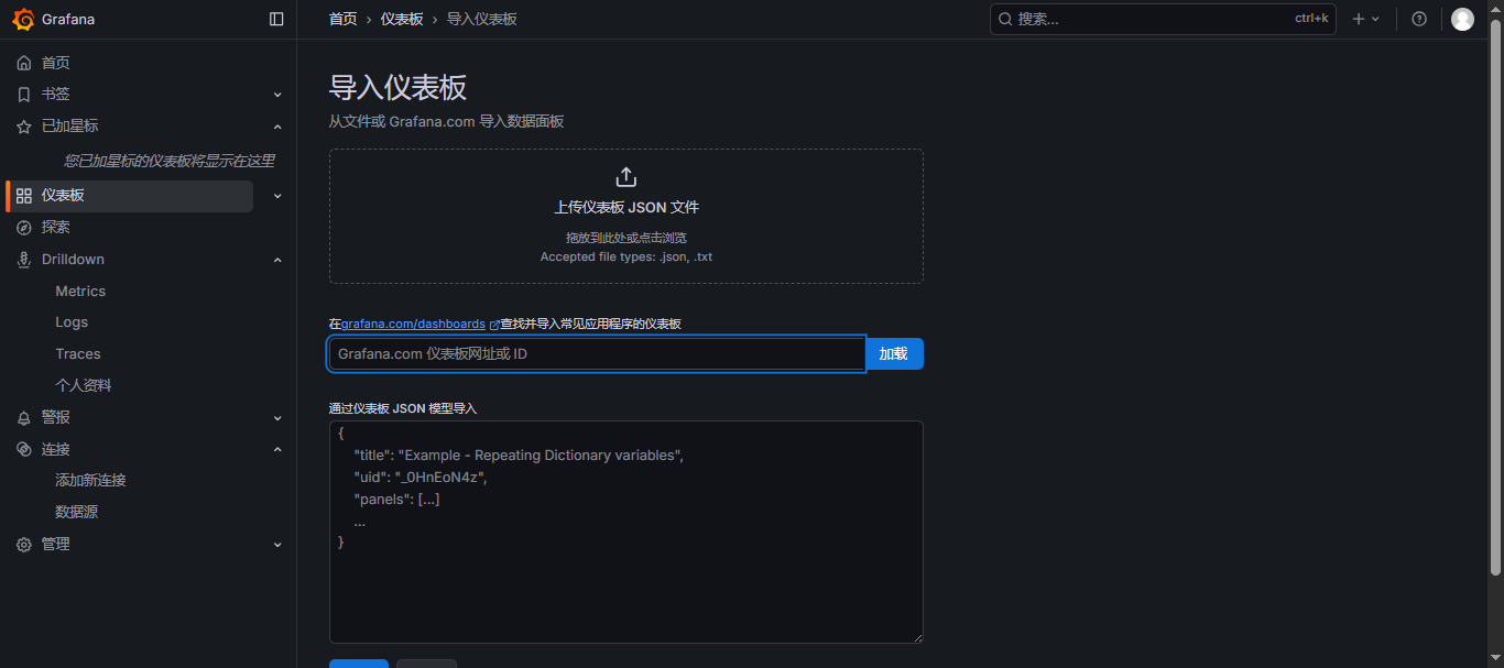 复制好id之后,打开在 Grafana 页面中,找到仪表板 --> 新建 --> 导入,选择自己导入的方式,输入 ID 号、网址或者上传 JSON 文件、输入JSON都可以,点击 加载;