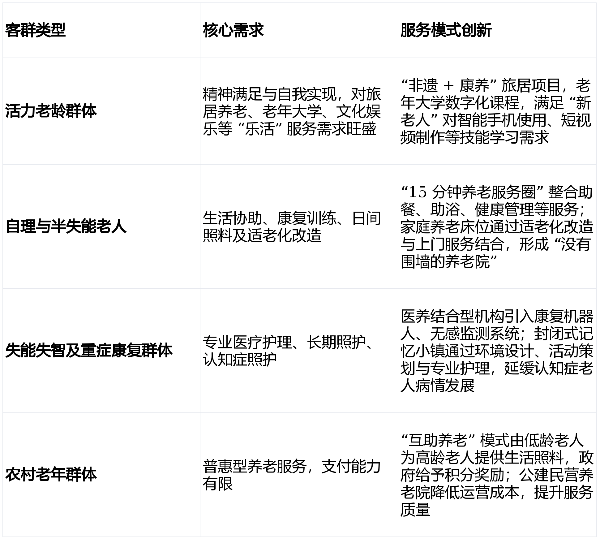 老年群体的代际差异与健康状态分化,推动养老服务向精细化、圈层化演进,中研普华划分了四大核心客群: