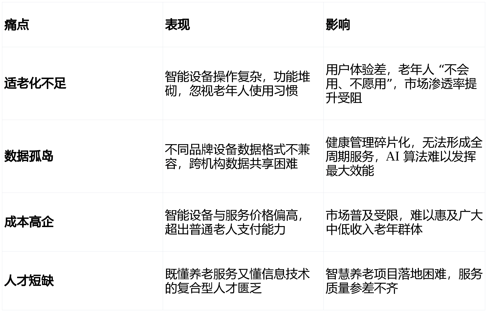 尽管智慧养老行业迎来爆发期,但仍面临三大核心痛点: