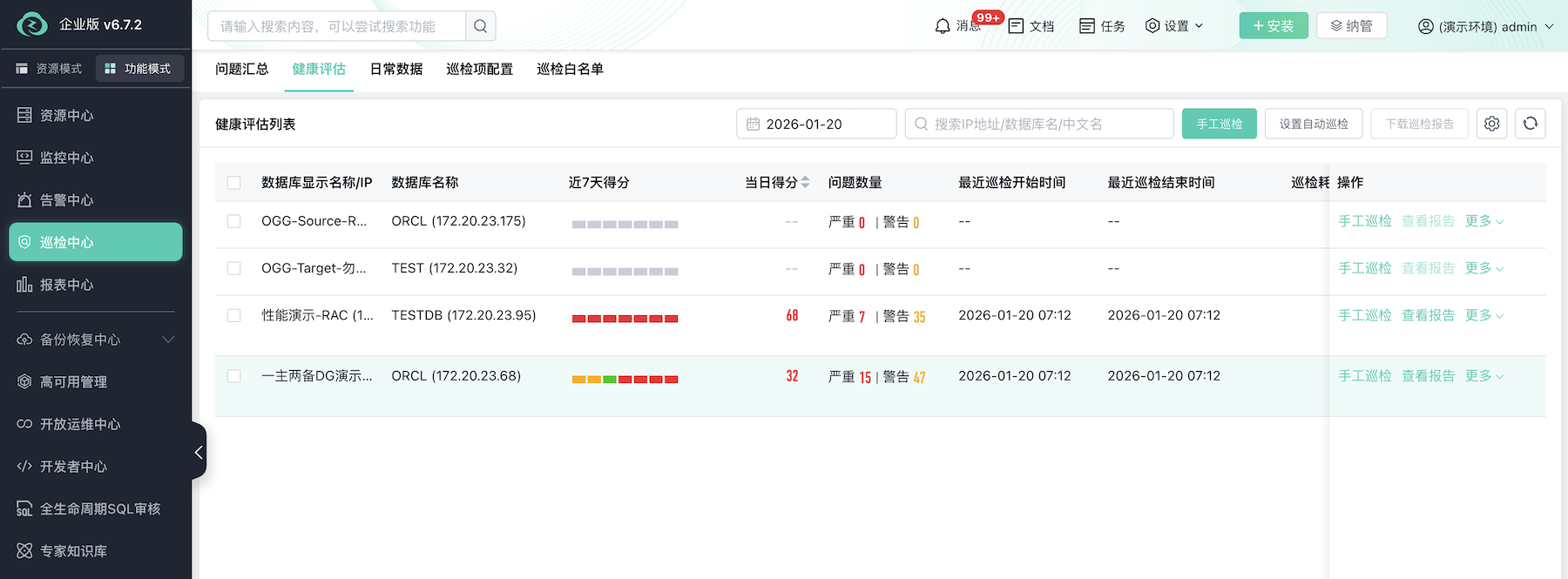 在资源管理层,zCloud实现了多租户模式的隔离与调度,案例客户的DBA可以通过运维大屏对数据库资源进行按需分配、快速开通。同时,平台在服务层建立了一套标准化的健康体检体系,运维人员通过"巡检中心"即可对全库进行健康评估。这种全生命周期的自动化、标准化管理,不仅降低了对专家个人技能的依赖,替代了高重复性的人工作业,更让数据库环境像云服务一样易于获取与调度,且全库环境可见、可控。