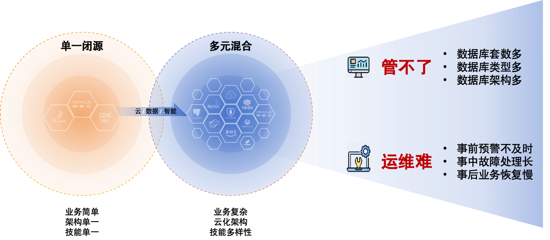 云和恩墨在长达十四年的数据库管理服务历程中,通过与成百上千家各行业头部客户的深度合作,敏锐地察觉到数据库技术正处于一个"万象更新"的转折点:从早期的单一闭源时代,走向如今开源、国外商业、国产与云数据库并存的多元混合时代。这种"百花齐放"虽带来了技术选择的自由,却也给企业带来了前所未有的管理重担------数据库套数激增、类型多样化以及架构异构化带来的多重冲击,导致传统"应激式运维"在面对突发故障时往往陷入被动:预警不及时、故障处理链条长、业务恢复慢、专家经验难以沉淀。