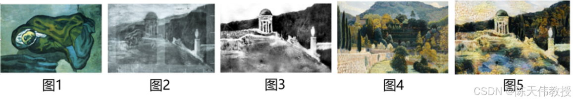 为了节省开支,他不得不在已经使用过的画布上创作新作品。如图 26.7所示,通过 X 射线扫描,人们发现毕加索在这一时期创作的画作《The Crouching Beggar》(图 1)背后隐藏着另一幅风景画(图 2)。经过人工编辑,这幅隐藏的画作得以部分还原(图 3)。这幅画描绘了巴塞罗那的奥尔塔花园,但由于是通过 X 射线扫描得到的,复原出的图像仅包含内容信息,缺少了色彩和风格细节。