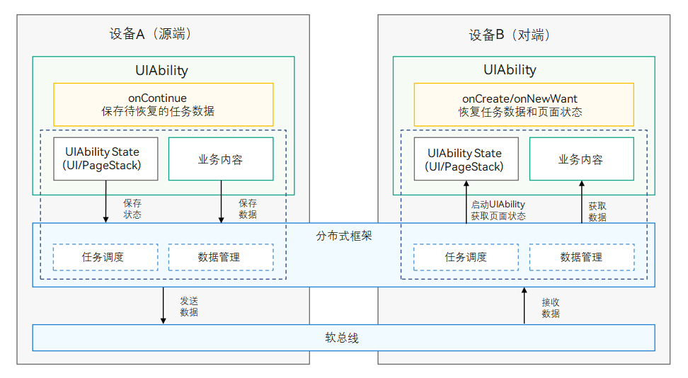 分布式框架提供跨设备应用界面、页面栈以及业务数据的保存和恢复机制,负责将数据从源端发送到对端。