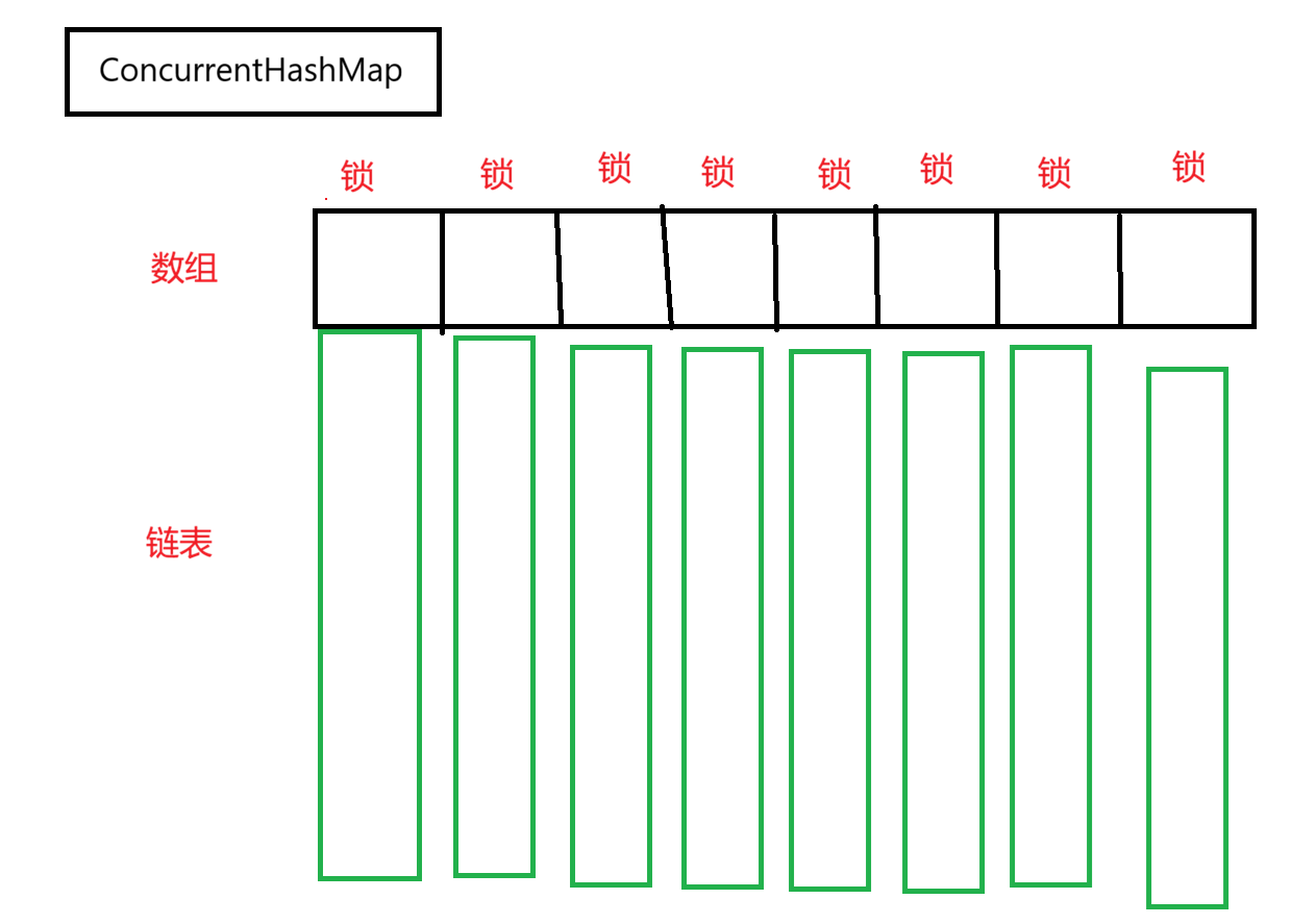 ConcurrentHashMap通过对数组中的每一个链表的头结点加锁。相较于整表加锁,多个线程同时修改同一条链表的概率就降低了。只有当两个线程都修改同一个锁对象上的数据,才会产生锁竞争。由于锁对象可以是任意对象,不需要额外开辟空间分配锁对象,只需要把链表头节点head作为锁对象即可。**这里要注意:加锁的开销大头不是分配锁带来的开销,而是产生锁竞争带来的阻塞等待的开销。**不必担心在数组规模较大的情况下,创建锁对象会带来很大的空间开销。
