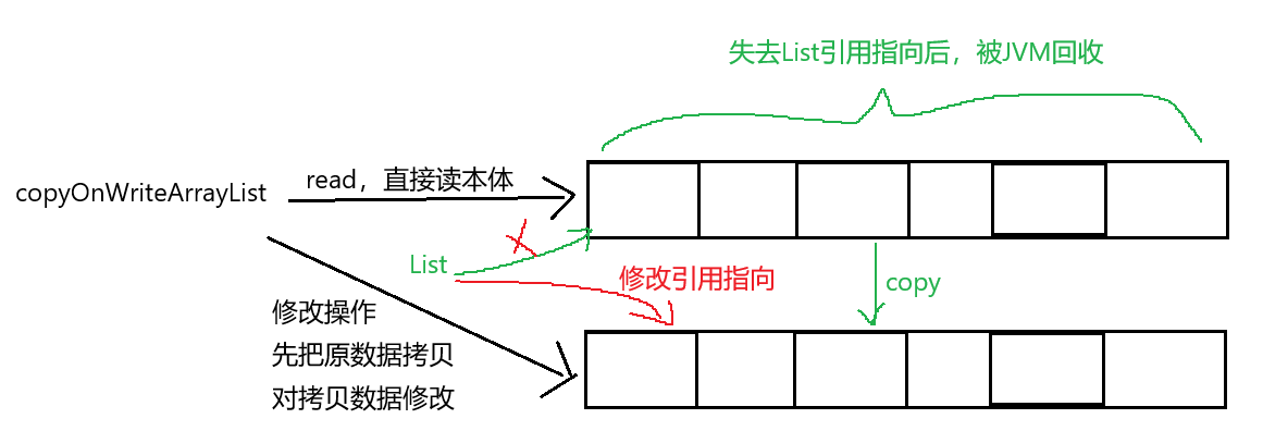 copyOnWriteArrayList的核心就在于 copyOnWrite写时拷贝这一点上。在多线程读取同一个变量时,天然线程安全,这个不必多说。copyOnWriteArrayList 使得在线程修改数据时不会对本体做出修改,而是先对原数据拷贝一份,在新的数据体上进行修改操作。修改完成之后,把原来旧数据对象的引用 修改,令其指向新的拷贝数据。那么旧的数据应该如何处理?(当然是放转转上回收啦~bushi)旧的数据由于其所处内存失去了引用指向,就被JVM自动回收了。