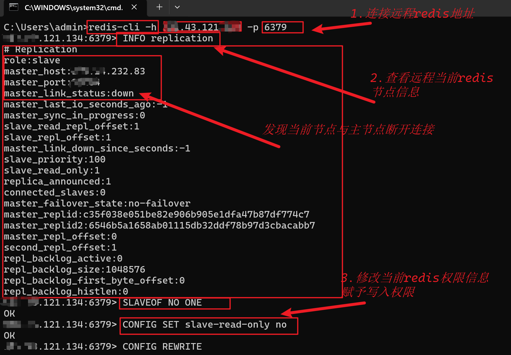 为了排查问题,我们在 Windows 终端尝试连接 Redis 服务器,成功连接 Redis 节点,并通过 INFO replication 命令排查节点信息: