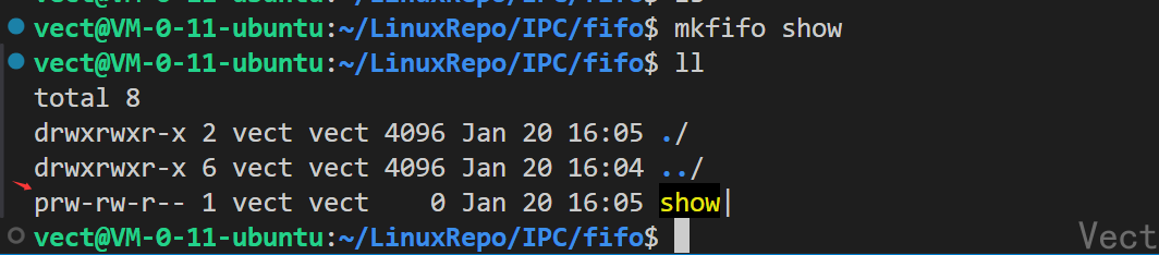 cppclass Server { private: int _fd; // 管道文件描述符 public: bool OpenPipeForRead() { _fd = OpenPipe(gForRead); // 阻塞打开读端(无写端则卡在此处) return _fd >= 0; } int RecvPipe(std::string *out) { // 读取管道数据 char buffer[gsize]; ssize_t n = ::read(_fd, buffer, sizeof(buffer)-1); // 读数据 if (n > 0) { buffer[n] = 0; // 字符串结束符 *out = buffer; } return n; // n=0:写端关闭;n<0:读错误;n>0:读取字节数 } }; // main函数:循环读消息,检测写端退出 int main() { Server server; server.OpenPipeForRead(); // 阻塞等客户端连接 std::string message; while (true) { if (server.RecvPipe(&message) > 0) // 读到消息则打印 std::cout << "client Say# " << message << std::endl; else break; // 写端关闭,退出循环 } server.ClosePipe(); // 关闭管道 return 0; } -