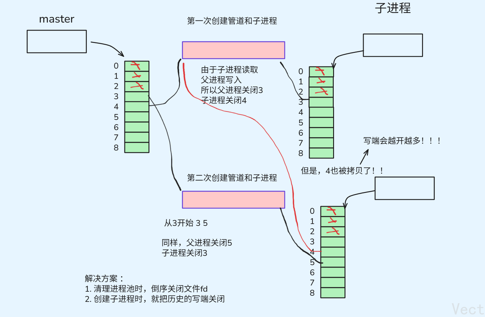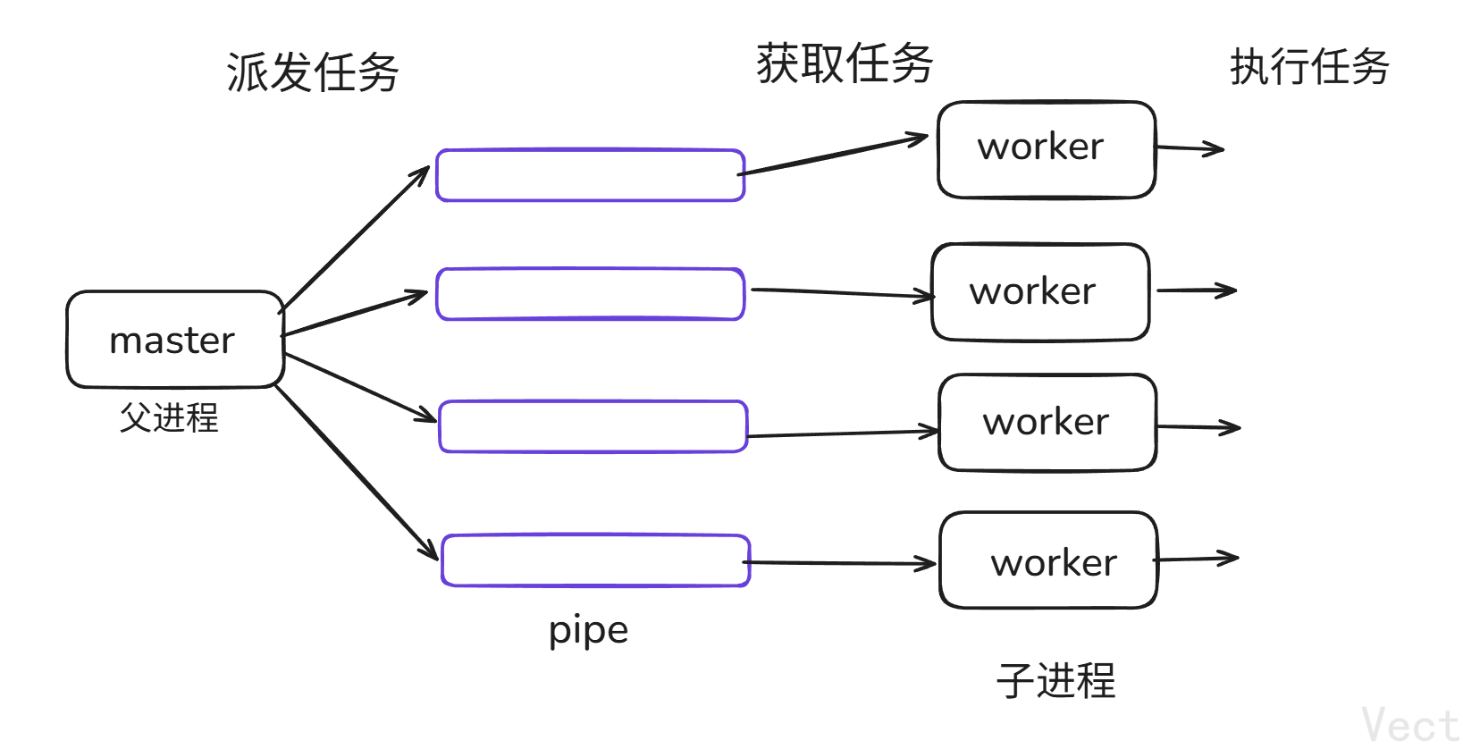 创建N个子进程作为工作进程,父进程(master)通过匿名管道想子进程派发任务,子进程(worker)读取任务并执行,实现任务并发处理