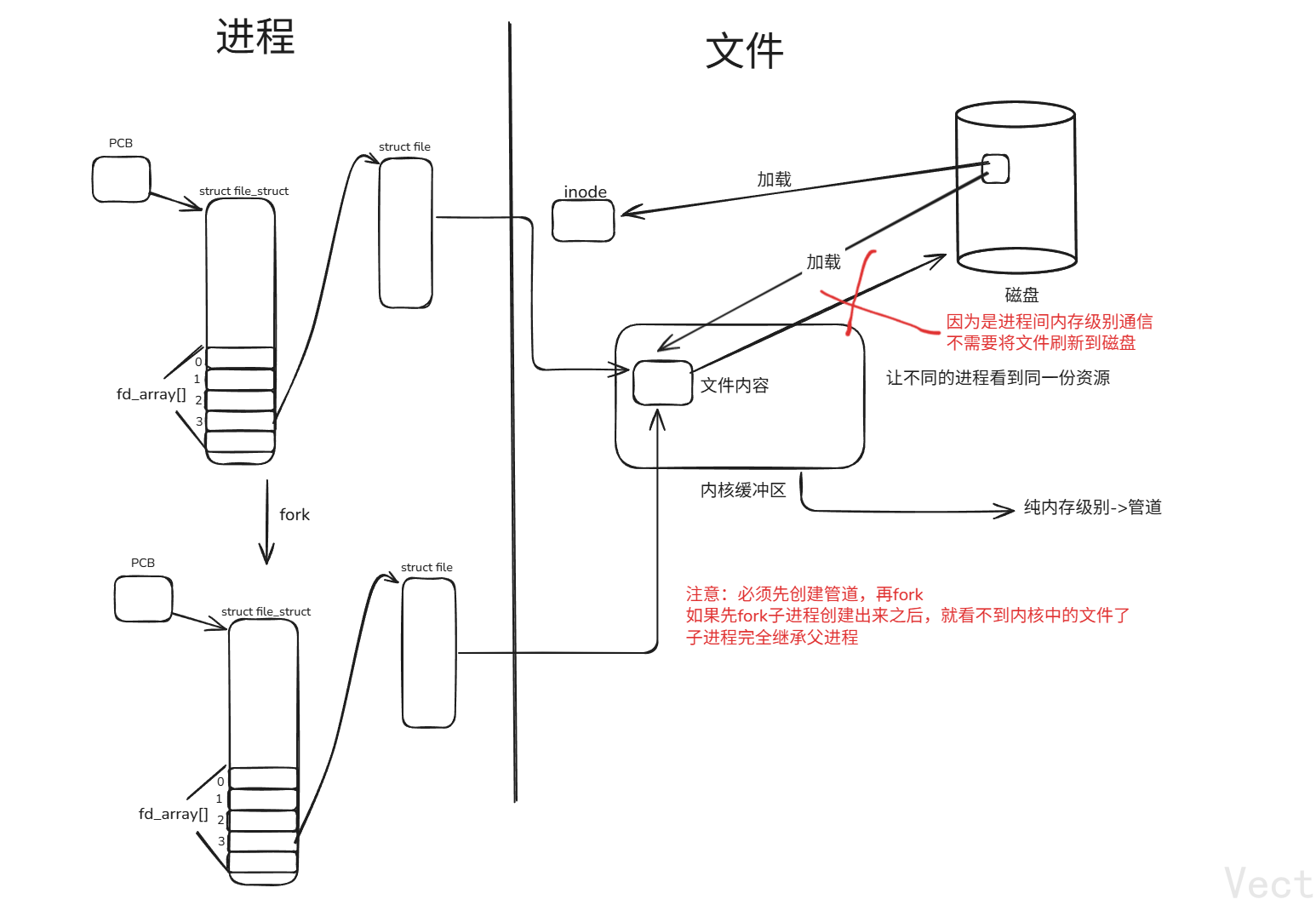 fork()后,父子进程各自持有一份fd_array数组,指向同一个内核管道和缓冲区**命名管道:**通过