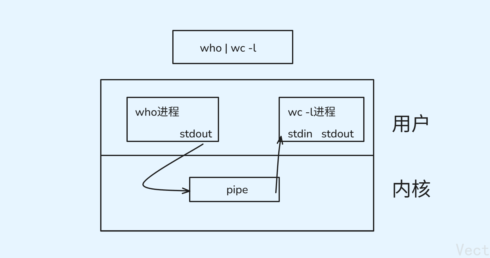 如上图,who和wc -l两个不同的指令就是两个不同进程,两个进程通过|管道连接数据流