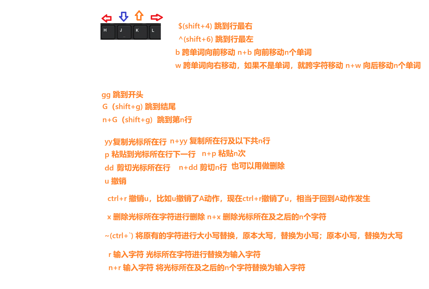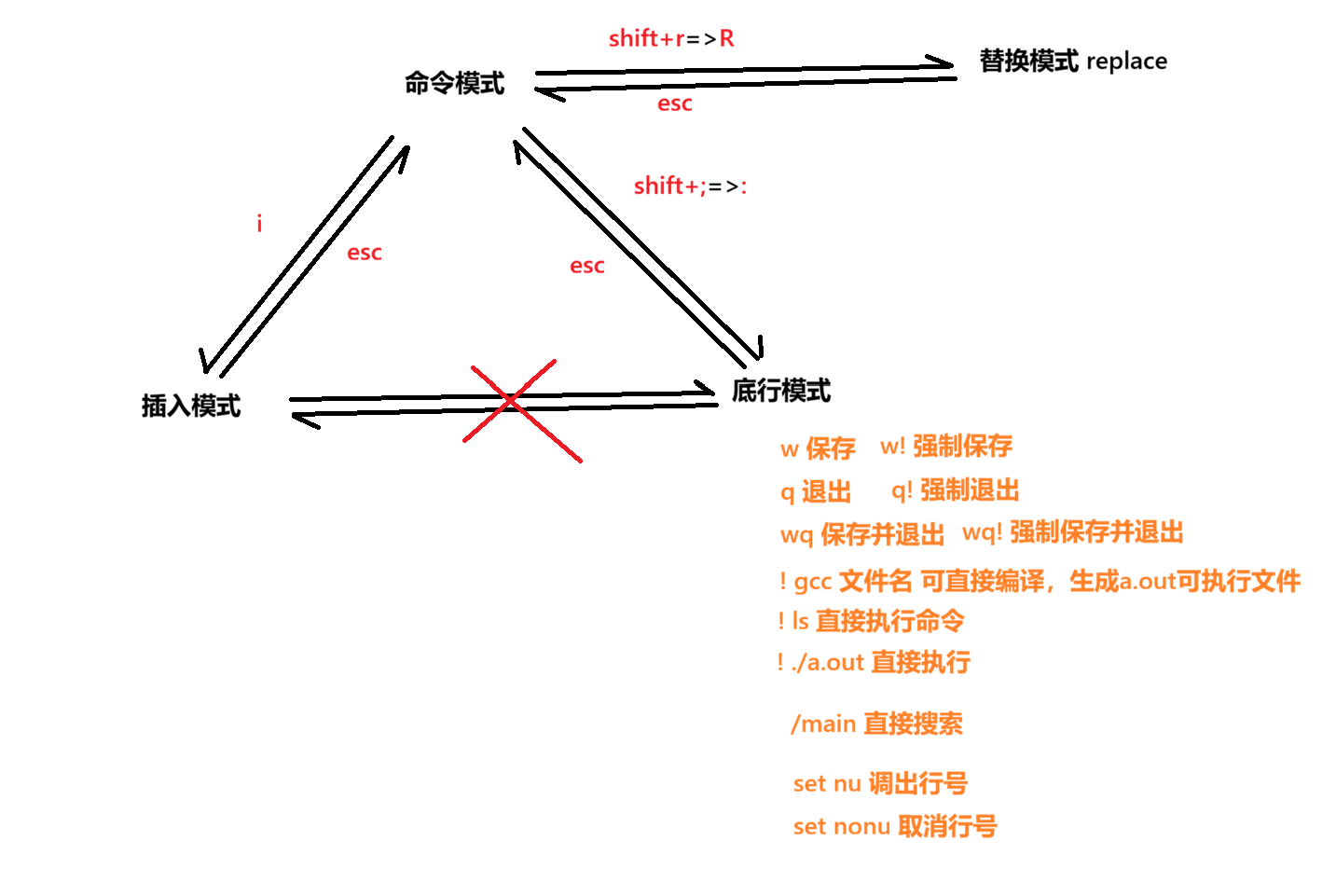 默认是命令模式,所有输入都被当成命令处理,常见命令如下