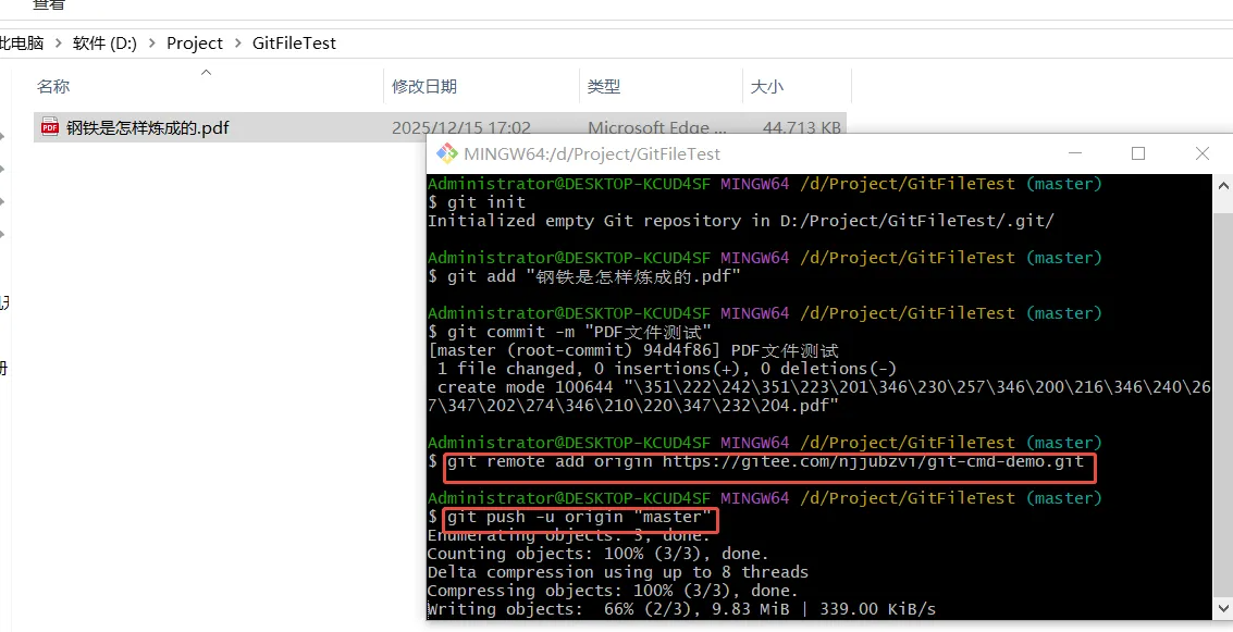 后面如果增加或删除新文件,重复如下命令,继续将文件传入本地仓库,然后再上传到gitee中