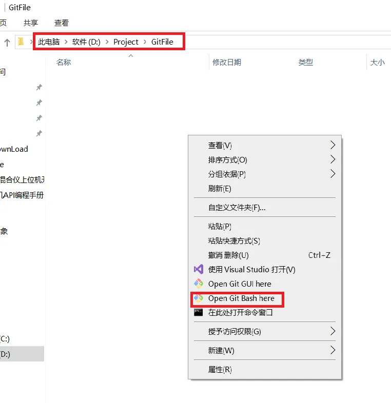 然后在新建文件夹中,右键鼠标,点击"Open Git Bash here",注意新建文件夹尽量不要用中文名或特殊字符。