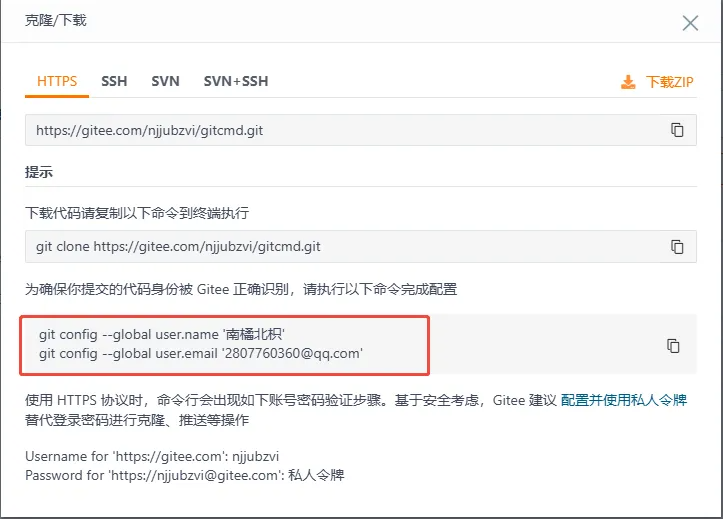 主要配置对应代码管理平台的用户名和邮箱。目前代码管理平台有github和gitee,不过考虑到网络原因,推荐使用gitee,虽然gitee也有诸多限制。在配置git之前,可以先在gitee创建仓库。获取用户信息。比如我在gitee创建一个gitcmd的仓库。