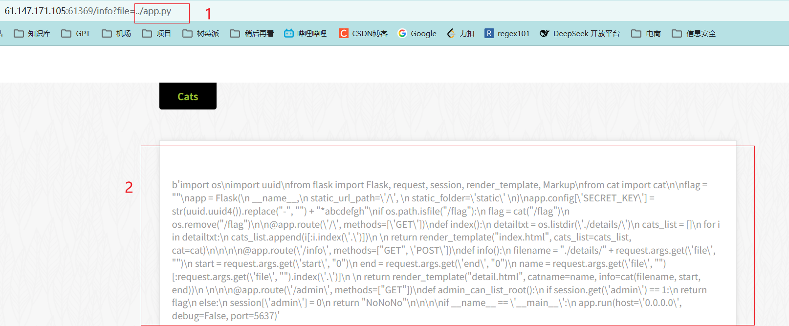 前面得知存在文件包含的漏洞,因此可以考虑构造payload: ../app.py, 得到app.py的源代码