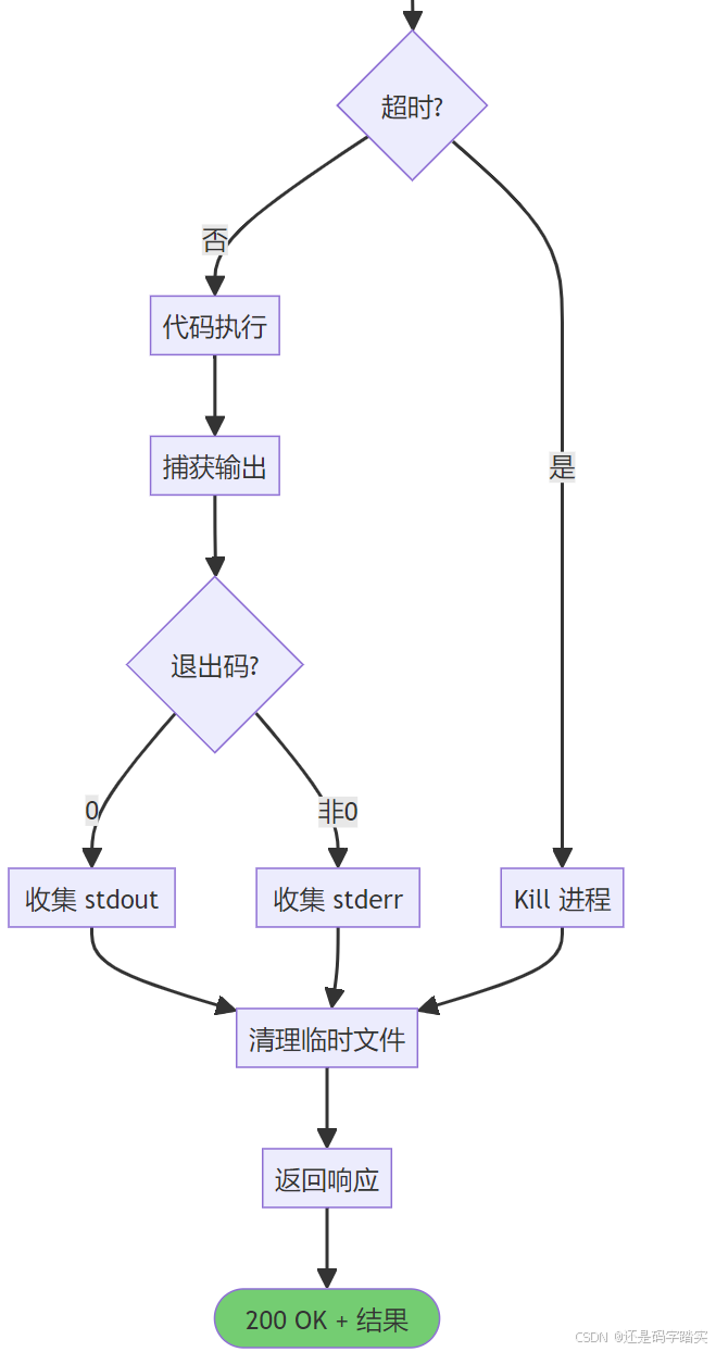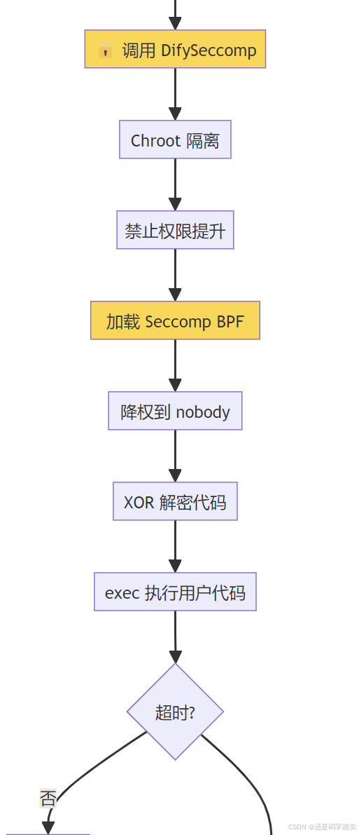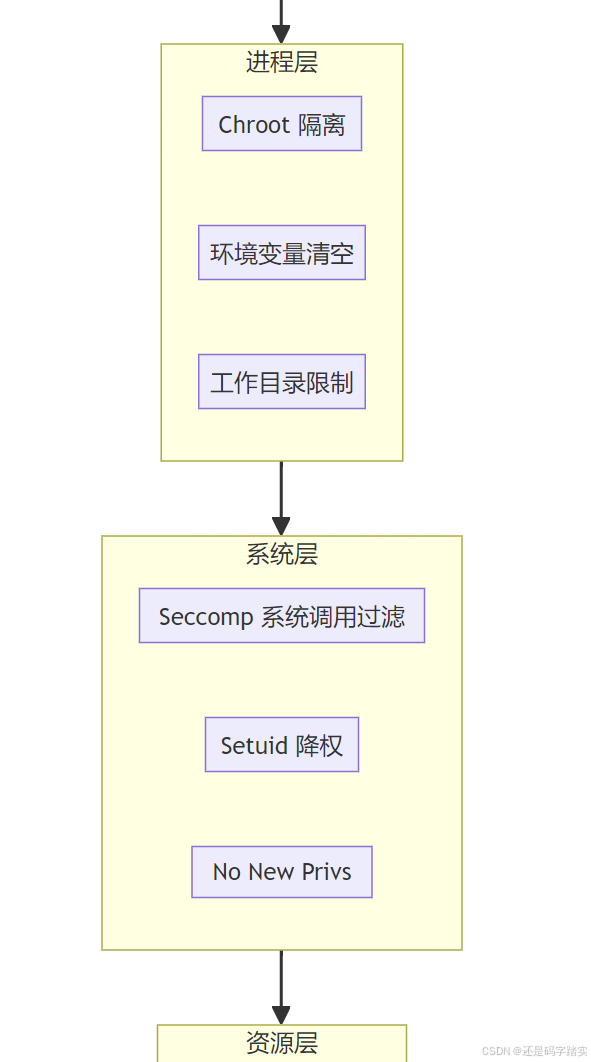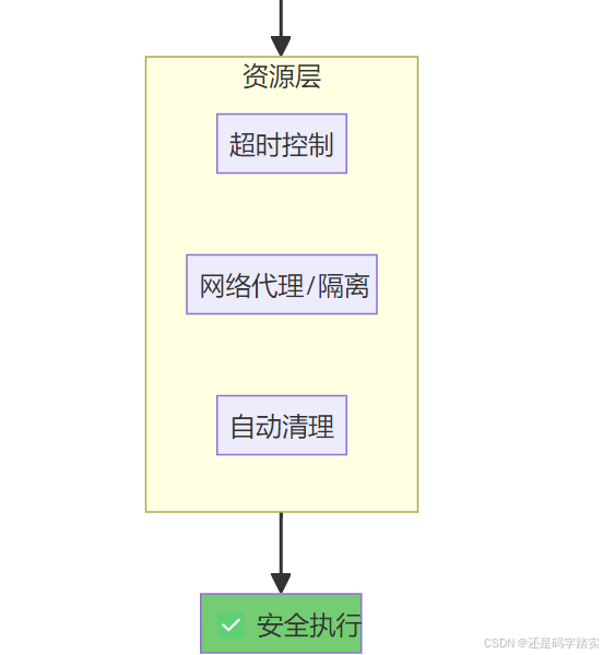 allowed_syscalls,仅允许代码执行必需的系统调用(如 read、write),禁止危险操作(如 mount、reboot、ptrace、execve)。 - 资源硬限制 :通过 cgroups 和 Docker 配置限制每个任务的 CPU(如 1 核)、内存(如 512MB)、执行时间(如 15 秒),防止 DoS 攻击。