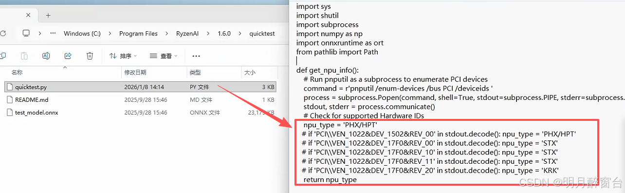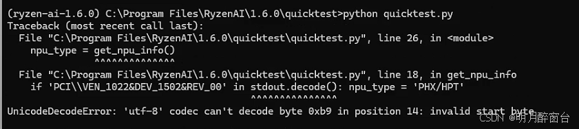 quicktest.py脚本搭建环境并运行一个简单的CNN模型。成功运行时,你会看到类似下方显示的输出。这表明模型已运行在NPU上,且Ryzen AI软件的安装已成功:- 如果出现如下错误,则需要打开.py文件进行修改: