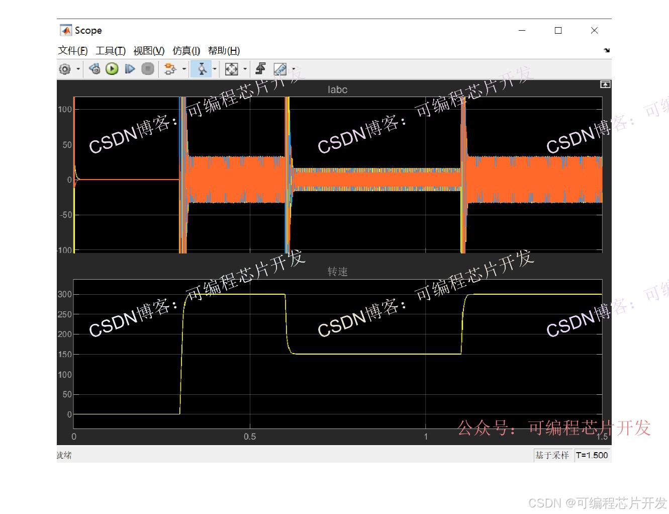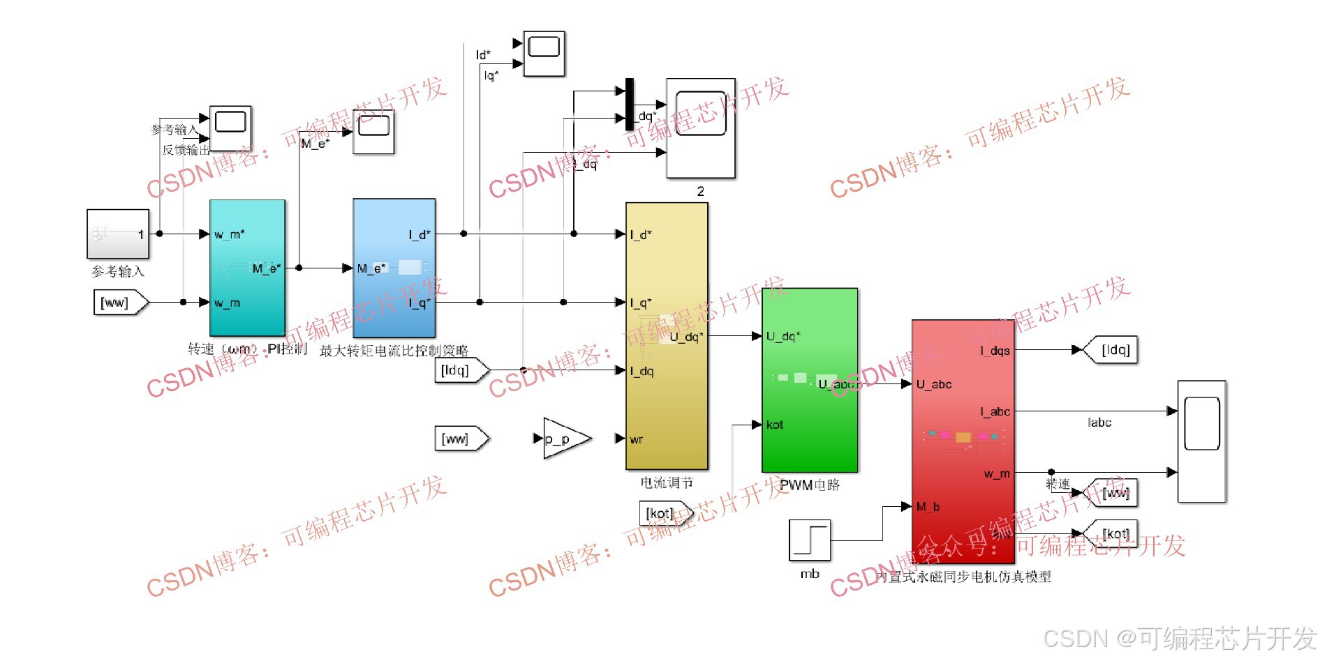 本系统为速度、电流双闭环矢量控制系统,核心目标是在给定转速下,通过最大转矩电流比(MTPA)控制,使电机在相同输出转矩下定子电流最小,从而提升效率、降低铜耗。系统通过坐标变换将三相交流量转换为旋转dq坐标系下的直流量,实现解耦控制,再结合MTPA算法生成最优电流指令,最终通过PWM驱动电机运行。