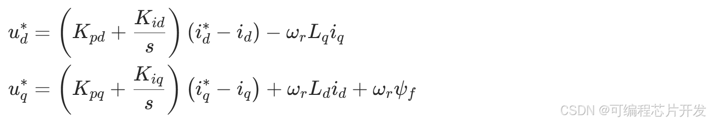 电流环PI控制电流调节,跟踪d、q轴电流,输出d、q轴电压指令ud∗、uq∗,实现电流解耦控制。