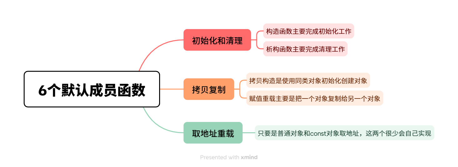 一个类在什么都不写的情况下编译器会默认生成6个默认成员函数。6个中最重要的是前4个,后两个相对不重要,了解即可。C++11之后还增加了两个默认成员函数:移动构造和移动赋值。