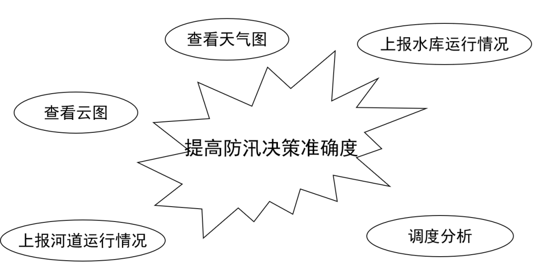 愿景和功能是不是一一对应的。一个愿景的达成可能需要在组织流程中使用系统的多个功能。例如,图2-36中,"提高防汛决策准确度"是愿景,但不是系统功能。系统没有提供这样一项功能,领导输入一个准确度数值,确认,防汛决策准确度"duang"的一下就提高了。只有在各个岗位分别使用系统的"查看云图"、"上报水库运行情况"等功能之后,组织的"防汛决策准确度"这个指标才能得到提高。