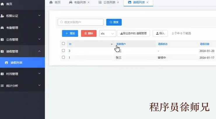 (5)请假管理:对请假的信息和人员进行管理。